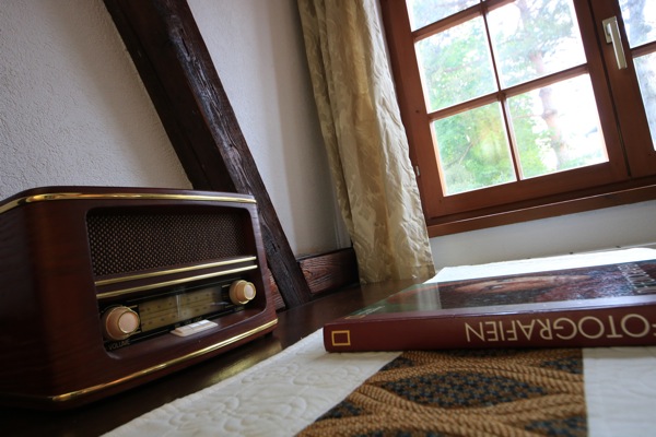 edlem historischem Eichen-Holzboden und historischem Kachelofen mit Ofenbank.